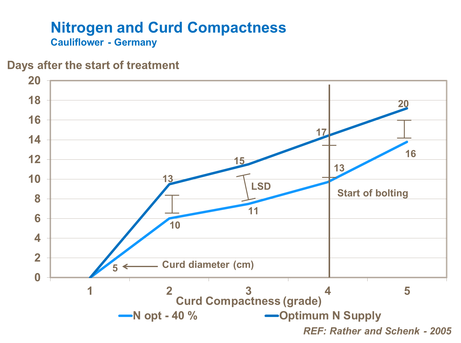 Nitrogen fuels brassica crop development and good supplies are required in wrap or guard leaves so that these can provide sufficient assimilates and nutrients for the curd or head. Good leaf/curd ratios and the highest quality compact curds can only be produced by applying optimum high rates of nitrogen.