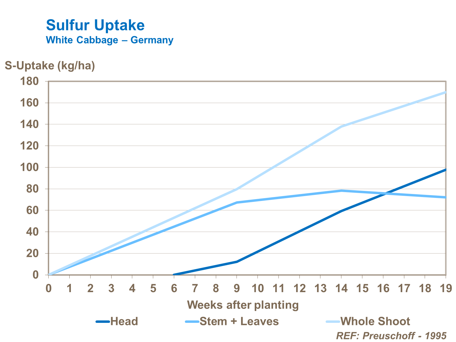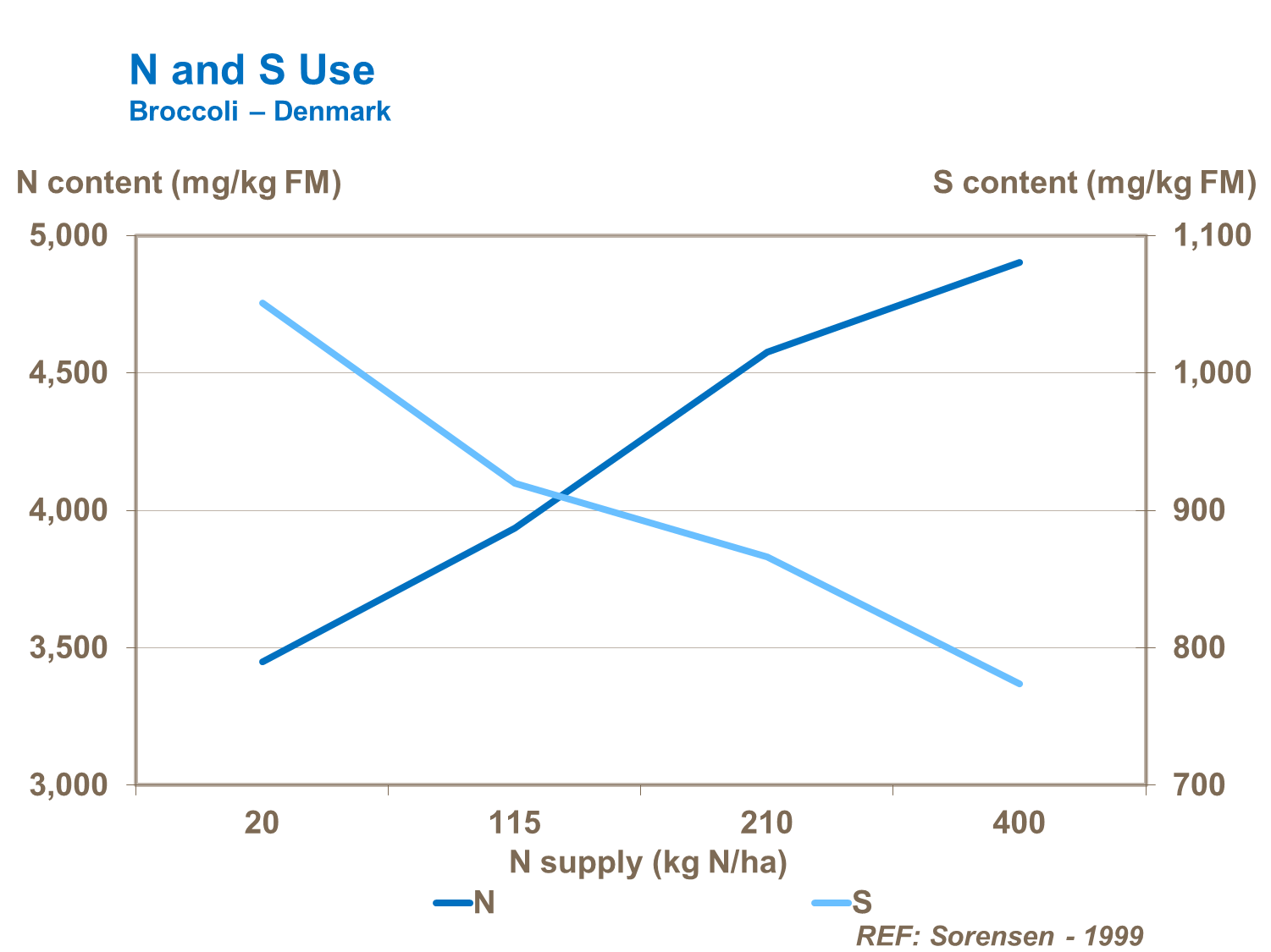 Sulfur is an important component of enzymes and other proteins, and is required for chlorophyll formation. A steady supply of sulfur throughout the season is needed. Care needs to be taken however, to match sulfur and nitrogen supply. Increasing nitrogen supply can restrict sulfur uptake. This is either a dilution effect due to better growth or a direct competition for uptake.