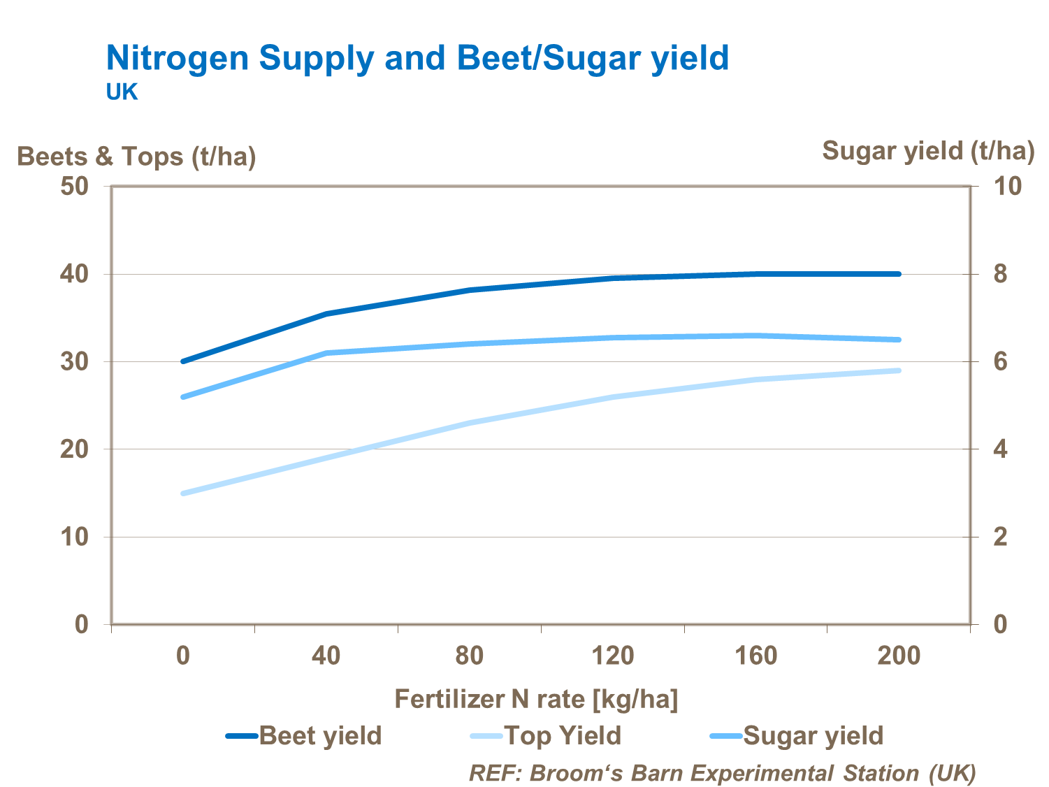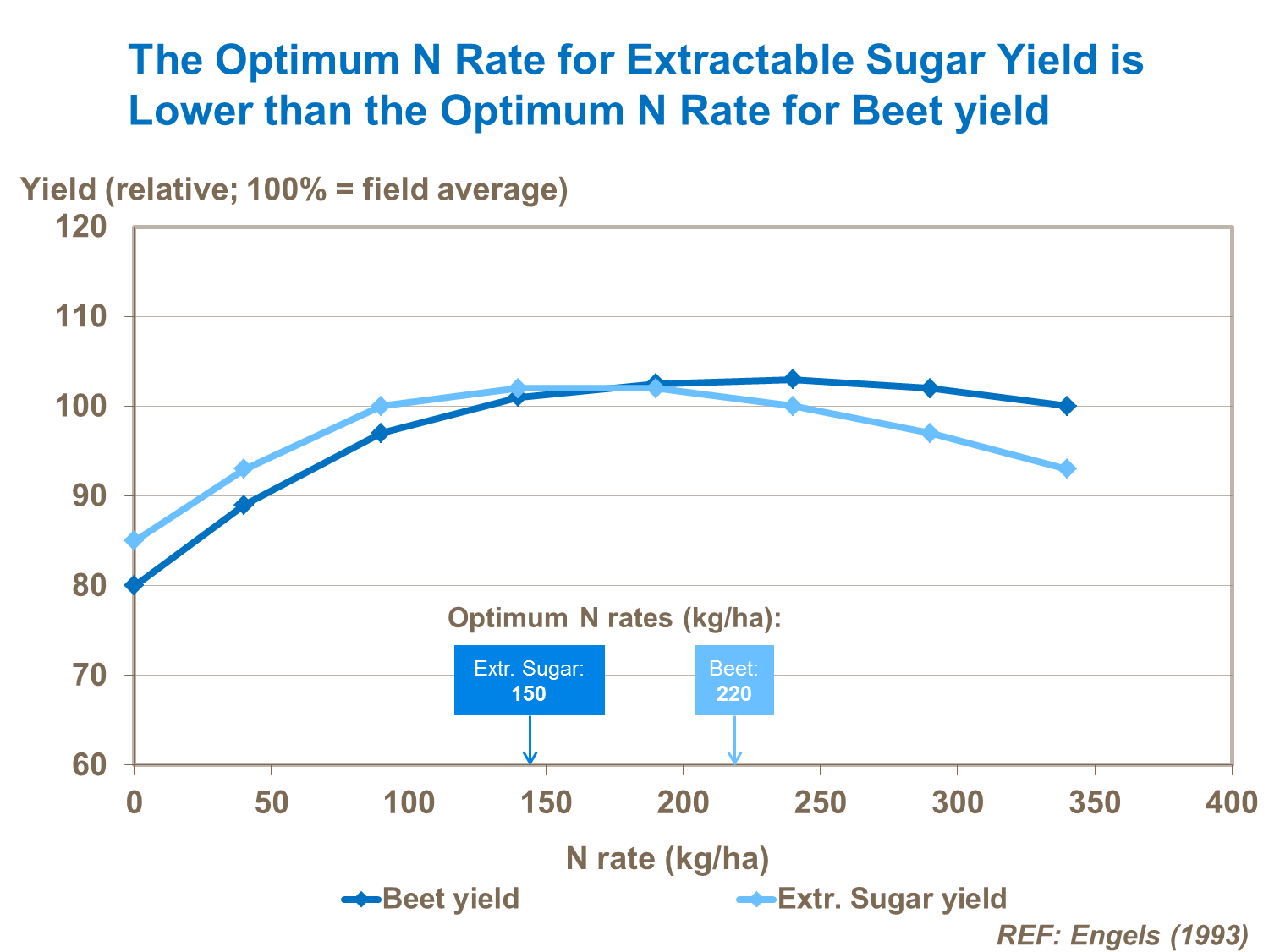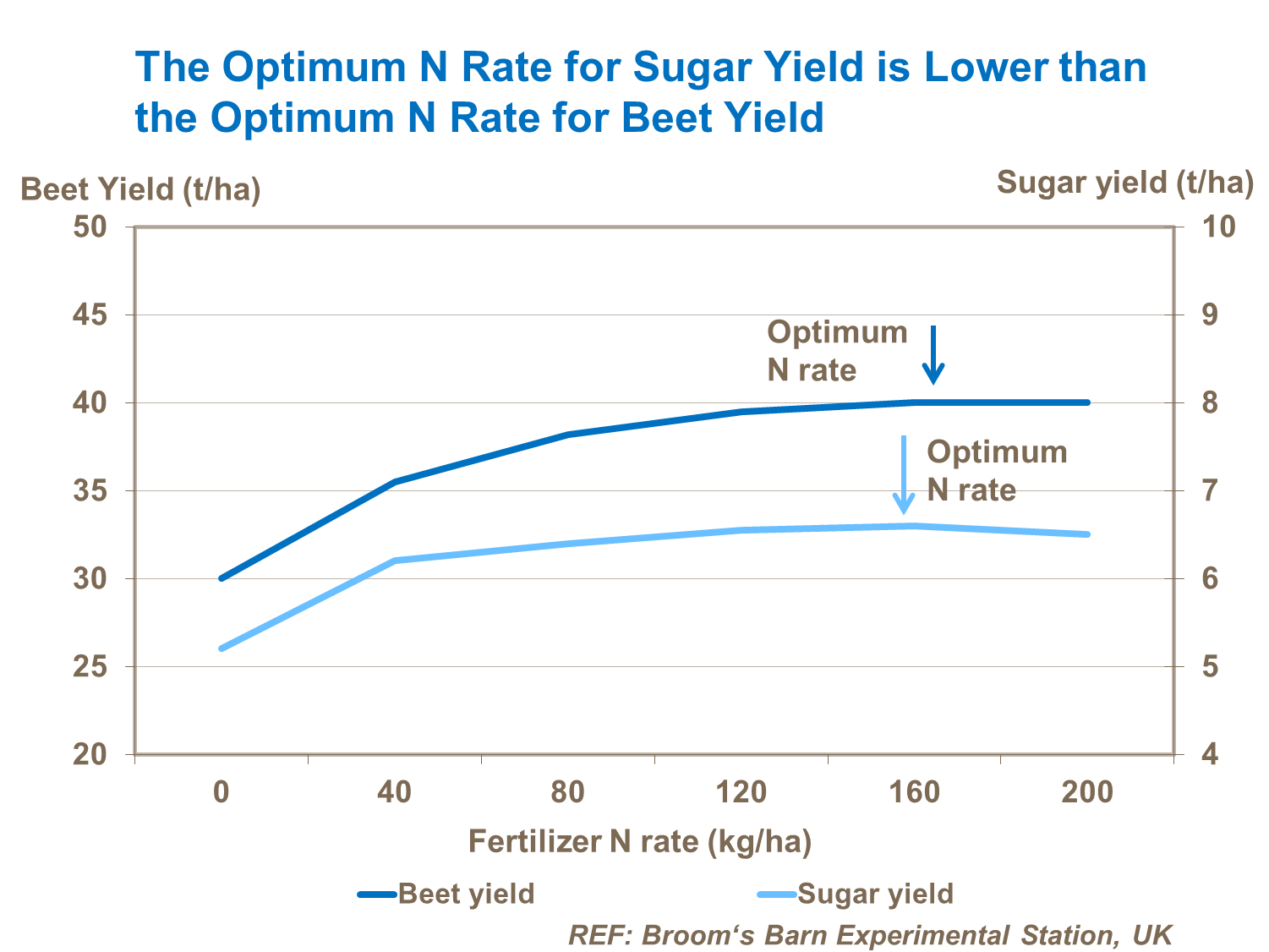 The optimum nitrogen rate for sugar yield is therefore lower than for the beet yield alone.