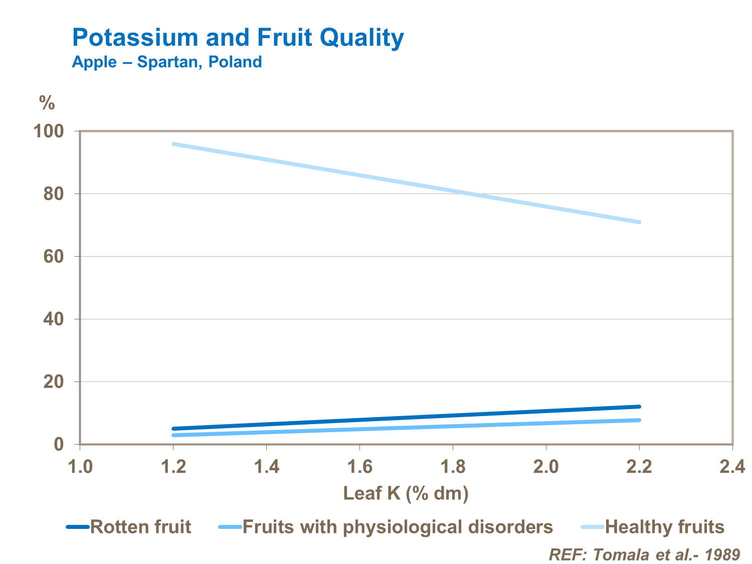 Il est important que les concentrations de potassium soient bien équilibrées avec d’autres ions métalliques, en particulier le calcium, car l’absorption préférentielle du potassium par rapport au calcium augmentera considérablement le risque de fruits pourris et de troubles physiologiques.