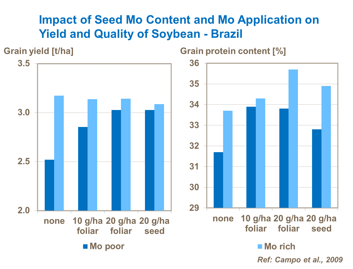De plus, des études scientifiques montrent que les graines contenant du molybdène et du cobalt montraient une augmentation de leur teneur moyenne des grains de soja. Des taux de Mn plus élevés augmentent également la teneur en protéines des graines.
